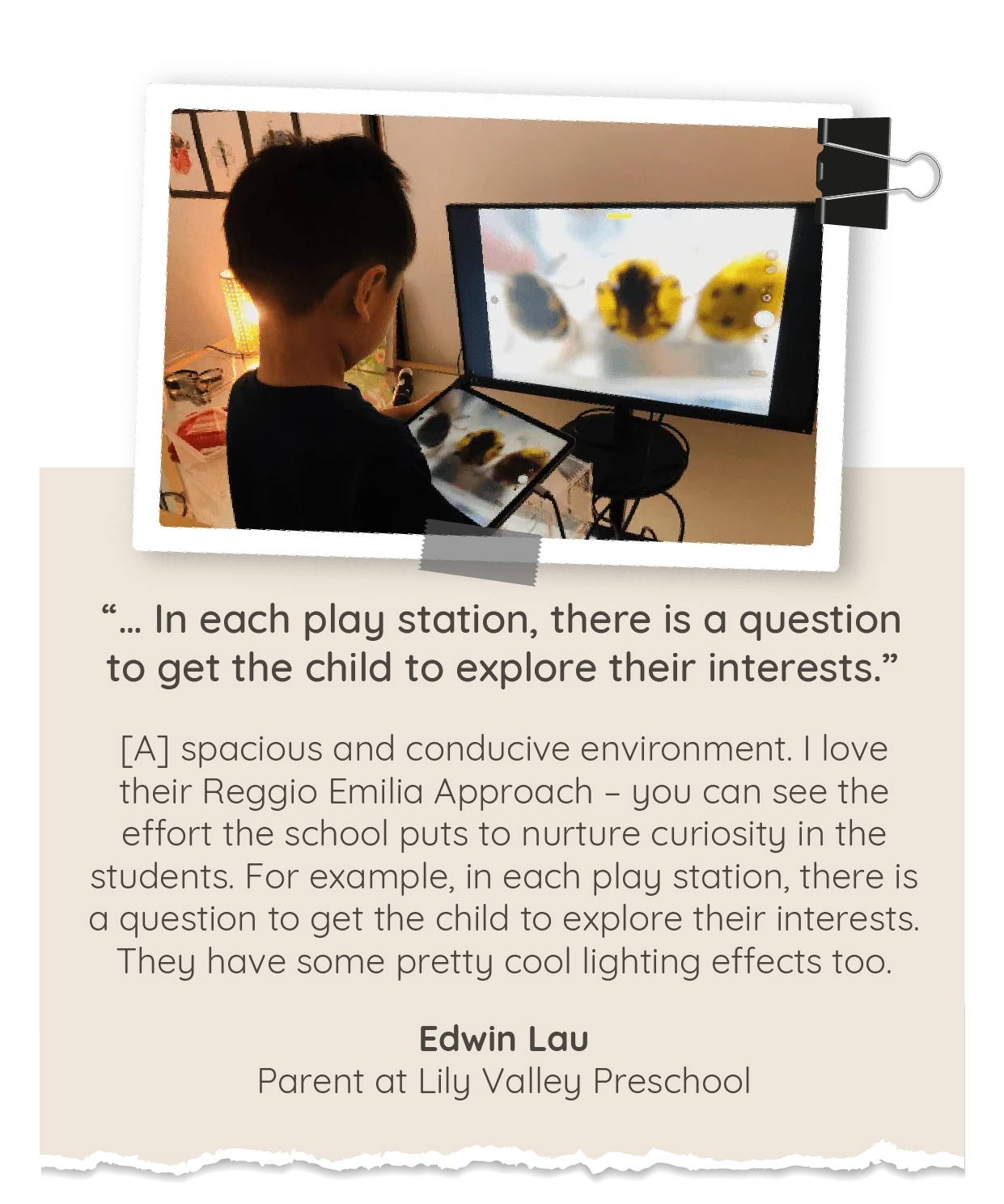 Many Reggio Emilia preschool reviews acknowledge regular and transparent communication between parents and teachers as a typical feature of these establishments. At Lily Valley, we even invite parents to view or participate in children’s learning projects.
